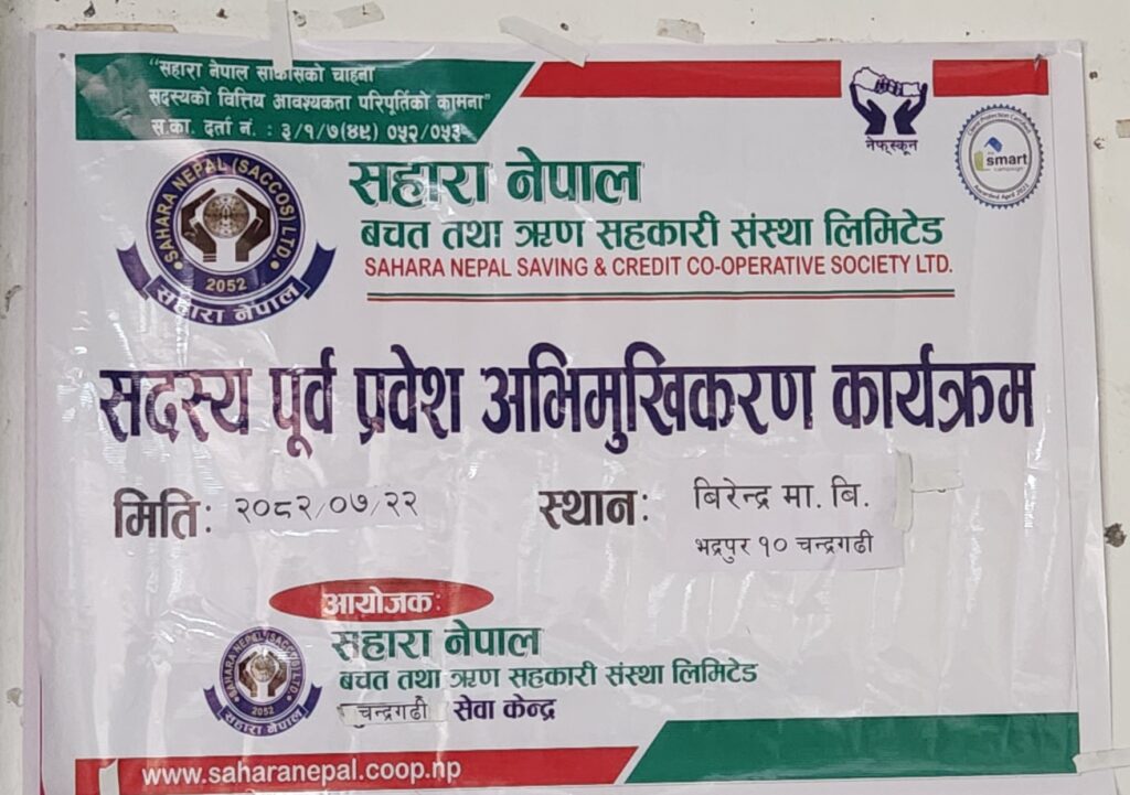 चन्द्रगढी सेवा केन्द्रका उपसमिति संयोजक गोपाल गिरीको अध्यक्षतामा सम्पन्न कार्यक्रममा सहाराको चारआली अनुगमन कार्यालयकी प्रमुख तथा उप–प्रबन्धक गोमा बस्नेतले सहकारीका वस्तु तथा सेवाबारे विस्तृत जानकारी गराउनुभयो। त्यस्तै, कार्यालय प्रमुख सुदिप खड्काले आचारसंहिता, सदस्यका अधिकार र कर्तव्य तथा अन्य समसामयिक विषयमा प्रकाश पार्नुभयो।